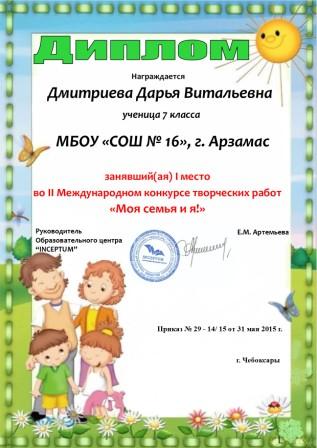 Диплом за творческие успехи и активное участие в жизни школы (2006 г., 2007 г.)
