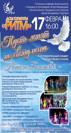 17.02.2019г. на сцене ДК Ритм прошел Благотворительный концерт «ПУСТЬ ЛЕТЯТ ПО СВЕТУ ПЕСНИ», подготовка к которому длилась целый месяц. 65 самых маленьких воспитанников нашего коллектива дарили всем гостям праздника свое видение и исполнение авторских песен Арзамасской поэтессы Натальи Ботяковой. Ни длительные репетиции и даже тяжелые минуты ожидания за кулисами не смогли погасить тот задор, эмоции и вдохновение наших крошечных, но уже опытных АРТИСТОВ.